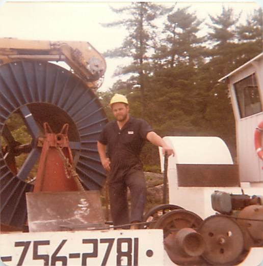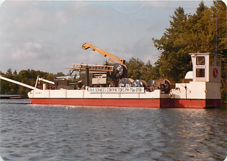 We used the landing at Dave’s Marina for the next four years until it was sold to a new owner who preferred that we move our operation elsewhere. Around that time, Andy decided to leave the partnership because he missed being with his family in Waterloo full-time. We came to a very reasonable settlement, and I continued working alone. A few months later, the bank interest rates went up to 22%, and like everyone who has a memory of needing to borrow money at that historic time, I held my breath and persevered. At that time, there was a lack of options for barge sites. I temporarily worked between Brandy’s Island, courtesy of Gord and Sheila Brandon, and the old government dock landing at the Delawana Inn. After a few months, I approached Paul Macey, who owned the barge site and shop currently owned by Dennis Robitaille, about renting a space from him. Paul sold his barge and was semi-retired, so he said yes. Paul and I had a symbiotic relationship, always willing to help each other.