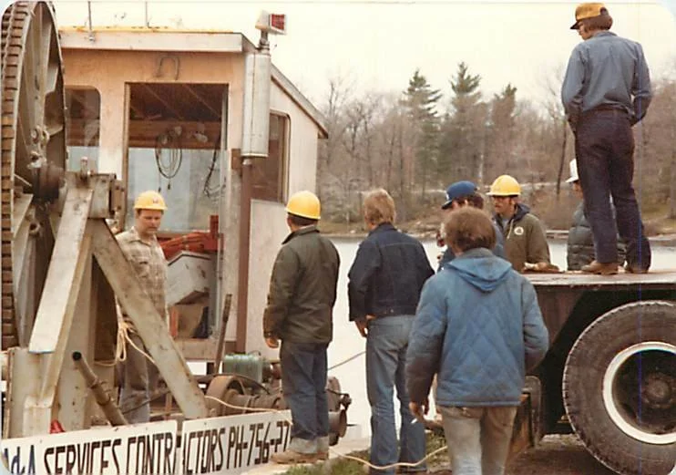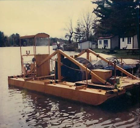 During those two years, Andy and I often mused about starting a construction business. Andy worked for a large metal fabrication company but was charmed by the idea of getting out of the city to work in “North Country.” In 1975, when I was 19 years old, Andy and I formed a simple partnership and began the construction of our first barge that was 20 feet wide, 40 feet long and five feet deep. The removable “engine compartment” housed a Detroit Diesel motor and a Hamilton Jet drive. Luckily, I was mechanically inclined and could remove an old diesel motor from a transport truck. I spent many long hours mounting the motor in the barge and coupling it to the jet drive with a good deal of help from Emery, Peggy and John O’Rourke, the owners of E. O’Rourke Storage and Marina (now known as Nautilus Marina). I worked at the O’Rourke Marina doing boat repair jobs and pumping gas. They were very good to me, allowing me to work on the barge after hours.